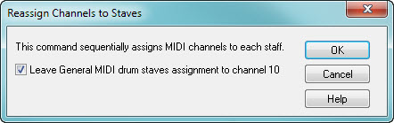 | 3. | If you click "Ok", then channel 1 will be assigned to the first staff, 2 to second, and so forth; but channel 10 will be skipped if the lower checkbox has a check mark. Using this method of assigning channels to staves all at once can be useful if you have a single MIDI playback device, but the original file used multiple devices and had the same channel numbers assigned to multiple staves. |